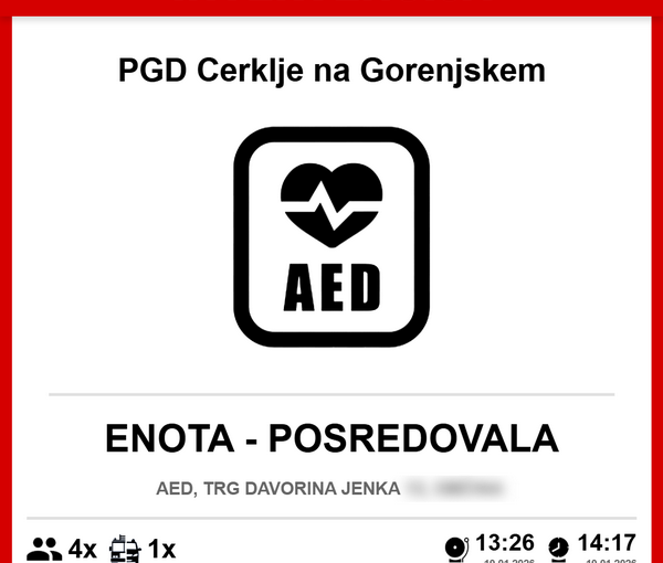 Ob 13.23 je na Trgu Davorina Jenka v Cerkljah, obolela oseba potrebovala pomoč. Prvi posredovalci PGD Cerklje smo oboleli osebi nudili pomoč do prihoda reševalcev NMP Kranj. Aktivirani so bili tudi prvi posredovalci PGD Zalog, vendar njihova pomoč ni bila potrebna.