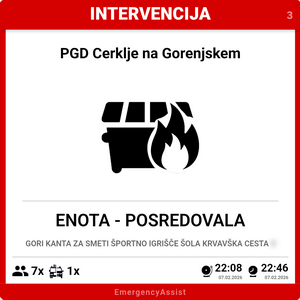 V soboto, ob 22.05 uri, je na Krvavški cesti občan opazil dva mladeniča, ki zažigata zabojnik za smeti. Gasilci PGD Cerklje in Zgornji Brnik smo požar v zabojniku pogasili. O dogodku so bili obveščeni policisti PU Kranj.